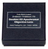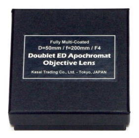 | 笠井の独自プロデュースによる高性能5cmF4EDアポ対物レンズ。異常低分散(ED=Extra-low-Dispersion)FPL51硝材を含む2枚玉EDアポクロマート設計により、短焦点ながら短波長域から長波長域までカラーシフトの少ない優れた色収差補正に加え、球面収差も良く補正されており、50〜60x程度の高倍率域まで十分なシャープネスを保つ高い結像性を示します。全面に施された丁寧なブロードバンドマルチコートにより高い総合透過率を誇り、クリアネスの高さも万全です。一般的な分離式ではなく、あえて貼付式を採用しているため、セルが不要で取扱も非常に簡単。もちろん丁寧なコバ塗りも施されており、側面反射光によるフレア等の発生もありません。自作望遠鏡用としてはもちろん、既存の5cmファインダー&ガイドスコープ等のアップグレード用交換対物レンズなど、多種多様な用途に幅広く使用可能。この小さな高性能対物レンズで、ぜひ大きな可能性を探ってみて下さい! |